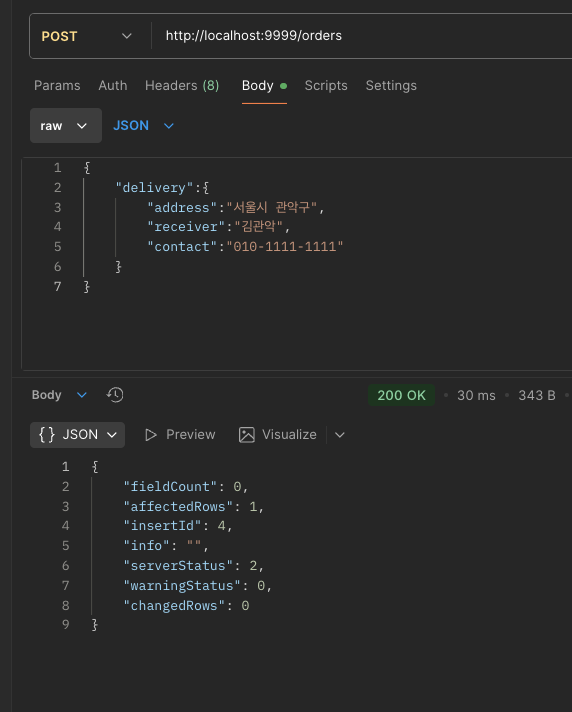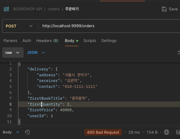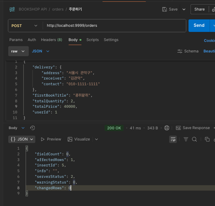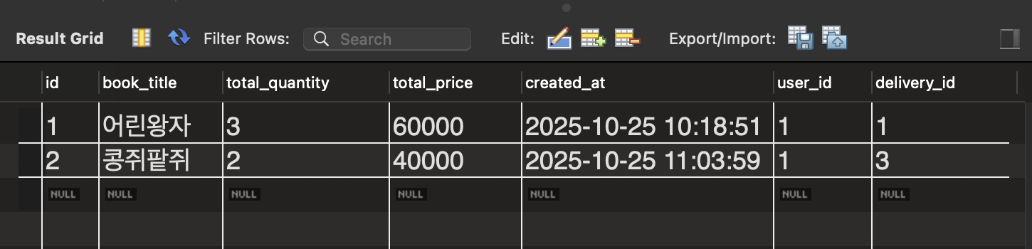 sql: "INSERT INTO orders (book_title,total_quantity,total_price,user_id,delivery_id) VALUES ('콩쥐팥쥐',NULL,NULL,1,3)",