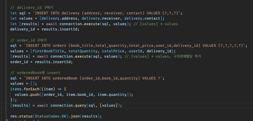 - 반대로 params로 items(배열)를 바로 넘기면 드라이버는 “각 ?에 하나씩 대응시킬 값들”이라고 보고, 쿼리 내 ? 개수와 파라미터 개수가 맞지 않아 오류가 나거나 엉뚱하게 동작할 수 있습니다.